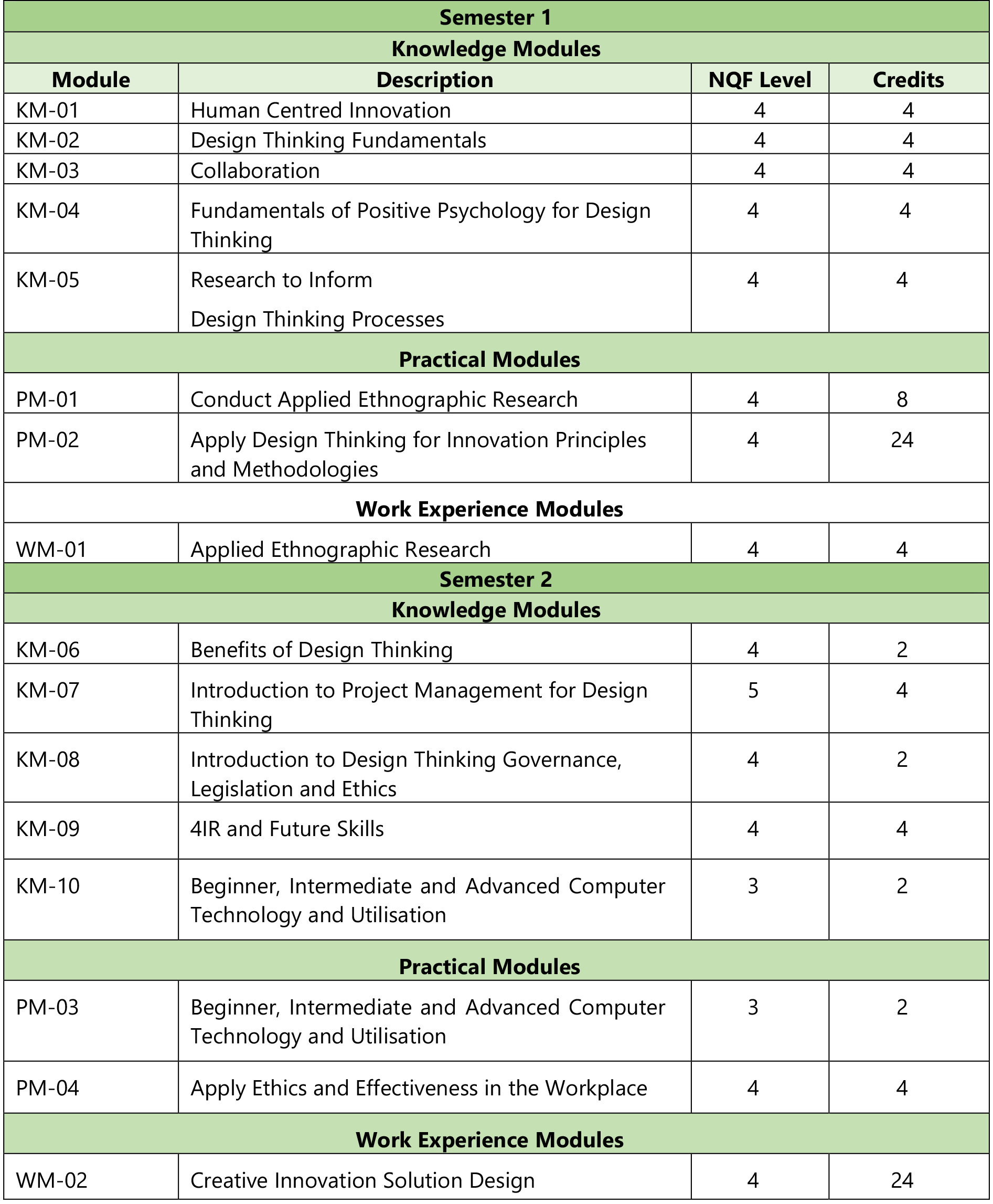 Modules include human-centred innovation, design thinking fundamentals, collaboration, applied ethnographic research, and project management, with a mix of practical and theoretical components.