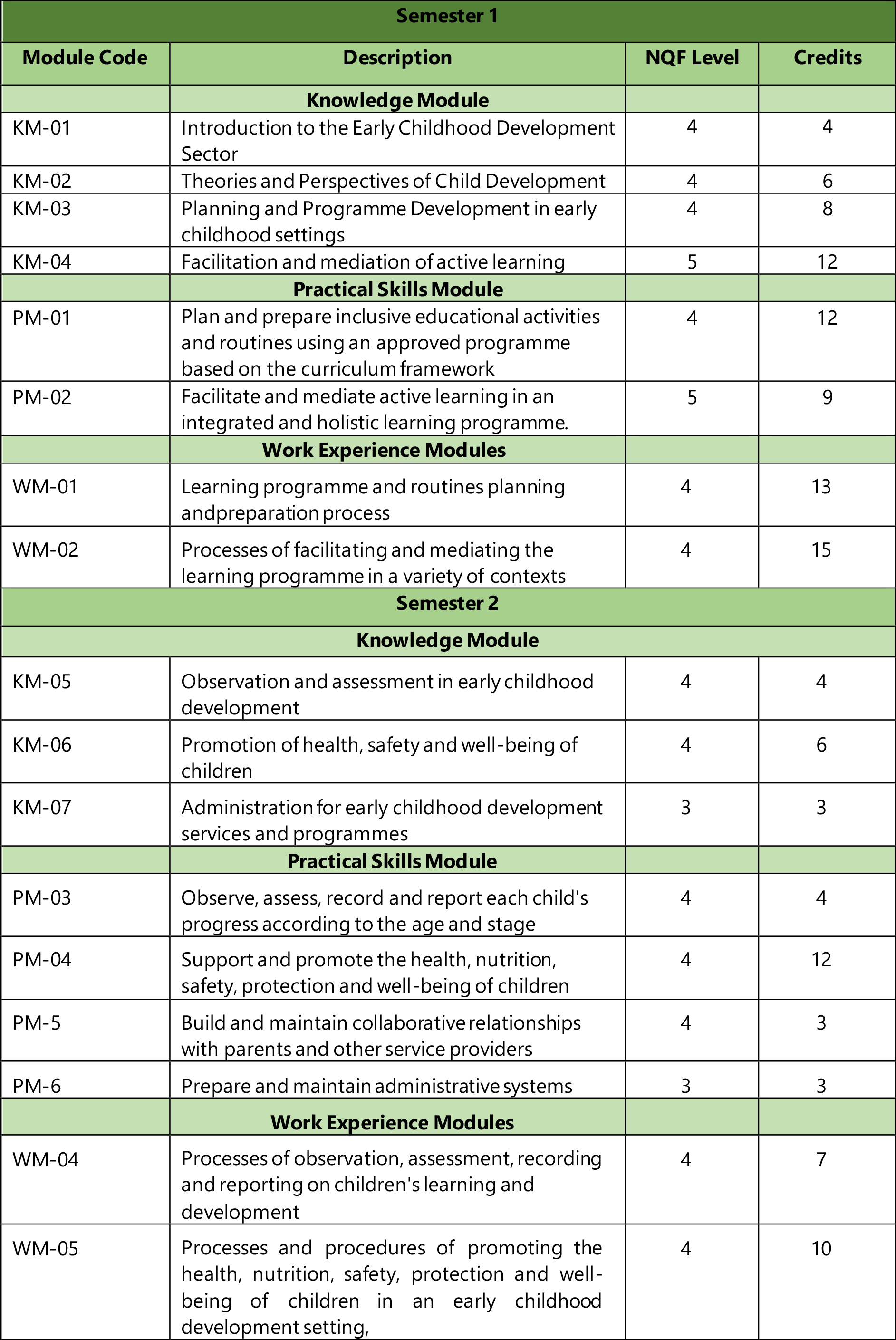Includes Knowledge Modules, Practical Skills Modules, and Work Experience Modules. Topics cover child development theories, active learning facilitation, health promotion, observation, assessment, and collaboration.