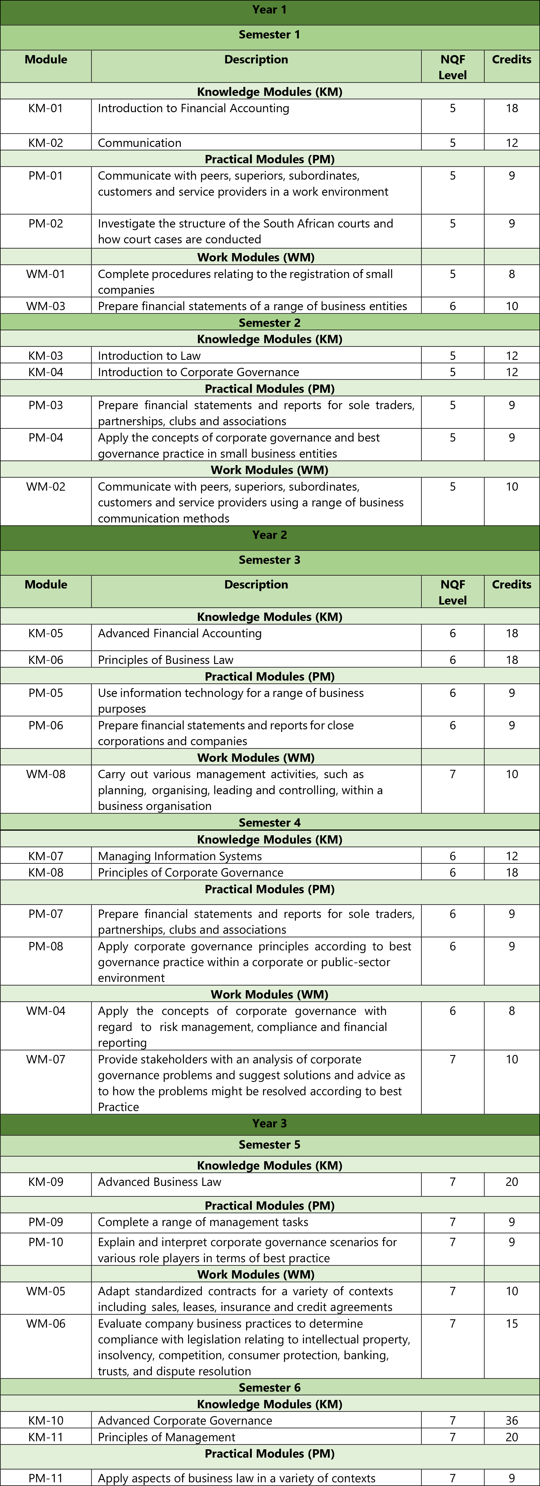 Modules across six semesters covering corporate governance, financial accounting, and compliance practices.