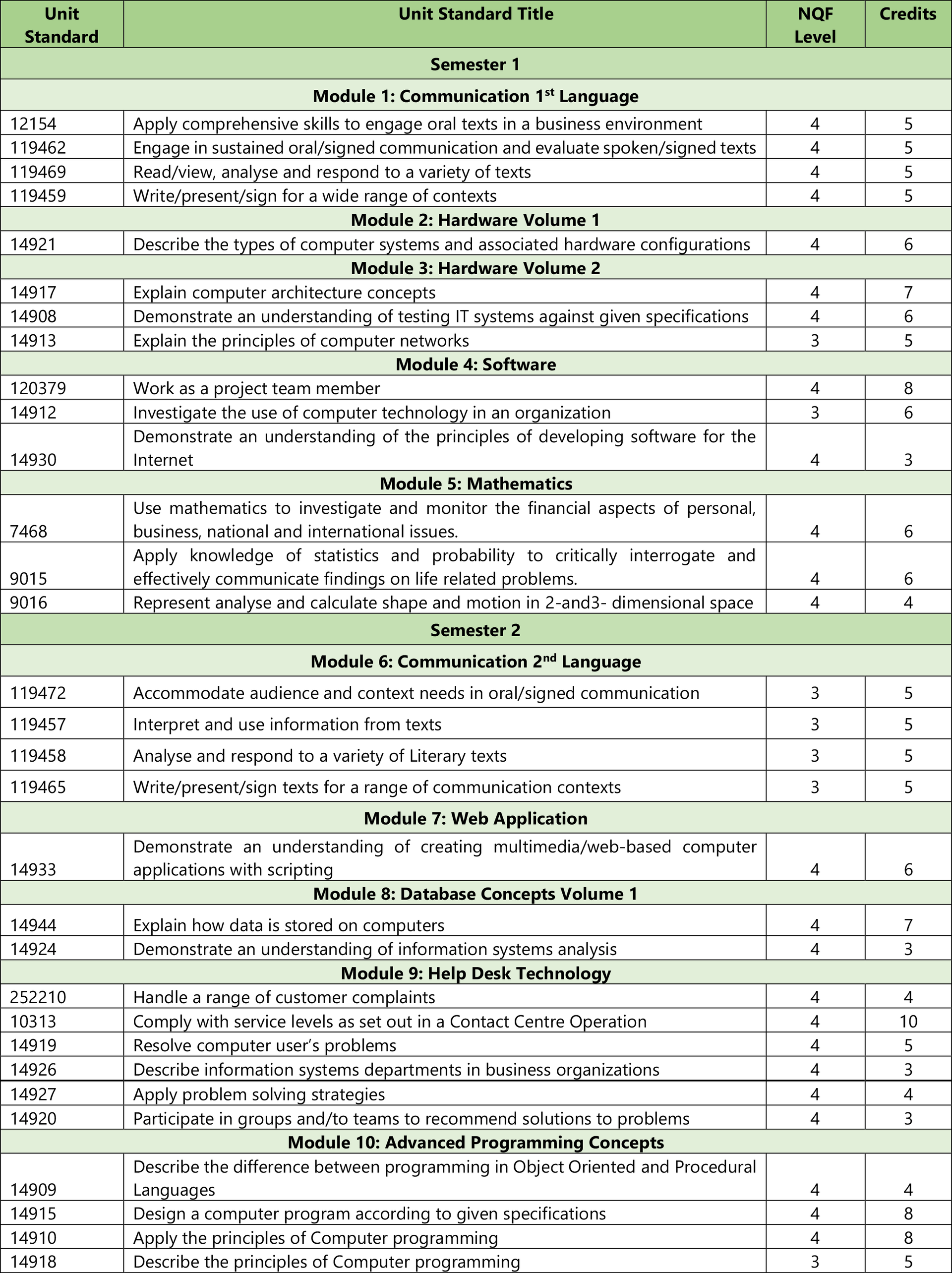 Structured into three components: Fundamental, Core, and Elective modules. Covers areas like communication, hardware, software, mathematics, web applications, database concepts, help desk technology, and advanced programming concepts.