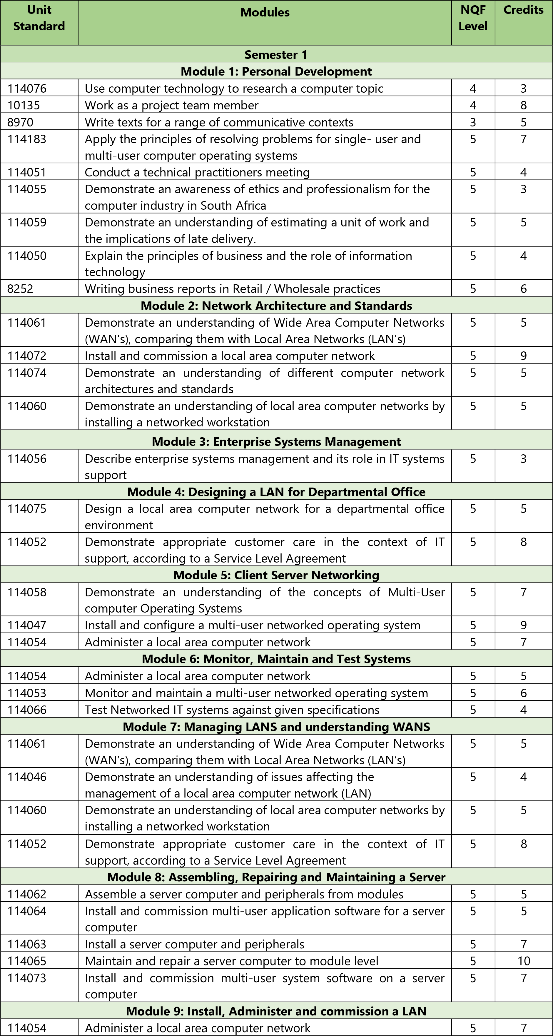Comprehensive modules across hardware installation, network management, customer care, and enterprise systems. Includes personal development, network architecture, and assembling and maintaining servers.